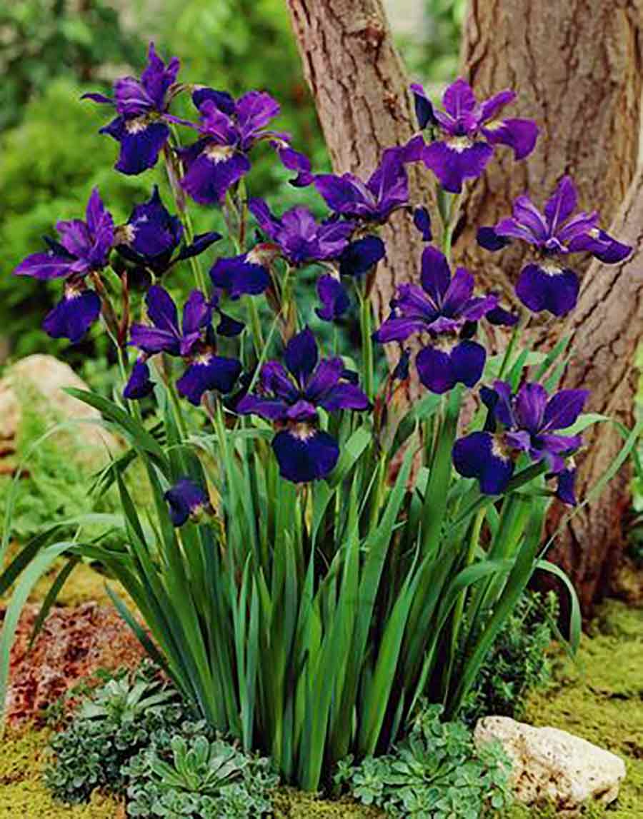 linear to sword-shaped leaves, nearly always in basal fans, and simple or branched flower stems. The flowers have 3 upright petals, called standards, and 3 large, pendent or spreading petals, called falls. Siberian irises lack the “beard” of colored hairs at the base of each fall that other iris groups have, but have very attractive vertical foliage most of the year.