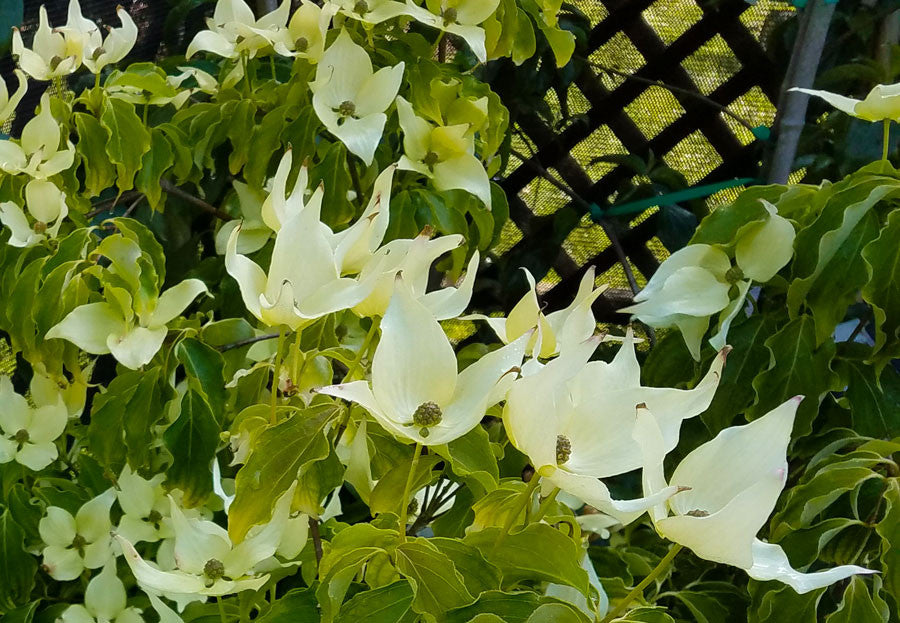 Cornus kousa 'Snow Tower' is the most columnar cultivar of the Korean Dogwoods. A new cultivar that flowers very heavily with very pointy pure white flowers, mostly covering all of the foliage for the month of June and July. Deep green foliage turns attractive shades of red in autumn. Early winter red 'strawberry-like' fruits that are typical of the species. The tree will be only 10-12 ft tall and 4 - 8 ft wide in 10 years. Hardy to zone 5.