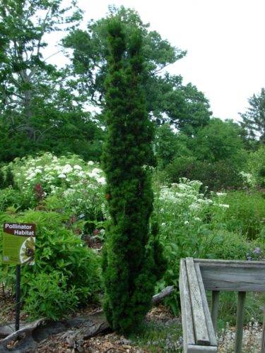 Taxus × media 'Beanpole' is an extremely narrow, slow growing, fastigiate selection of Anglo-Japanese yew with dark green foliage and abundant fruit. After 10 years of growth, a mature specimen will stand 6 feet (2 m) tall and only 2 feet (60 cm) wide, an annual growth rate of nearly 12 inches (30 cm).