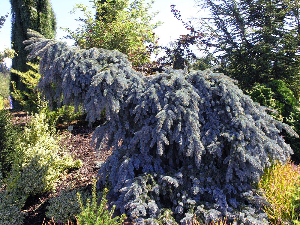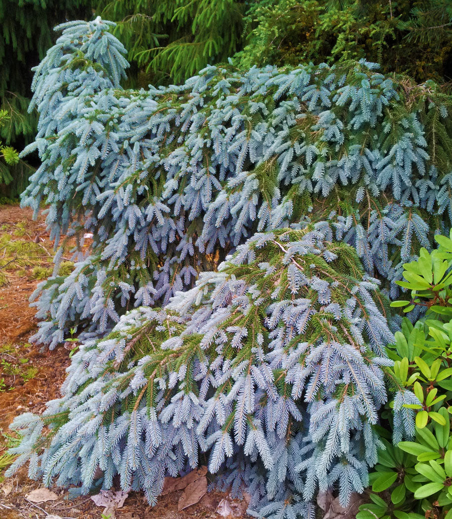 This weeping Colorado Spruce was found at Stanley & Sons Nursery in Boring, Oregon on a side sport of a 'Glauca Pendula'. It needs to be staked to create a nice specimen. The leaves are powder blue. This incredible cultivar resembles a weeping Norway spruce but with bright blue leaves and larger needles. Beautiful! The height of this plant is as tall as you stake it, but it will probably be at least 5ft wide in 10 years.
