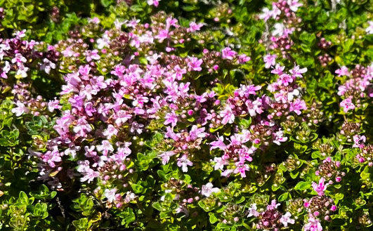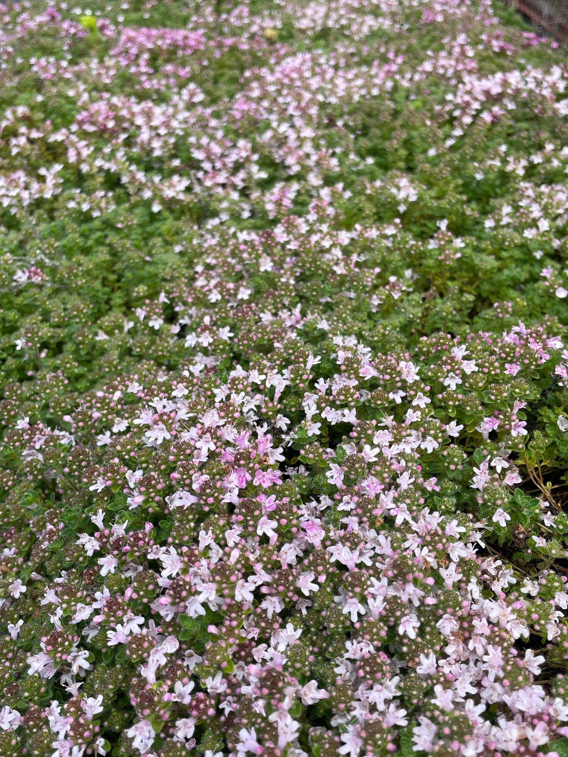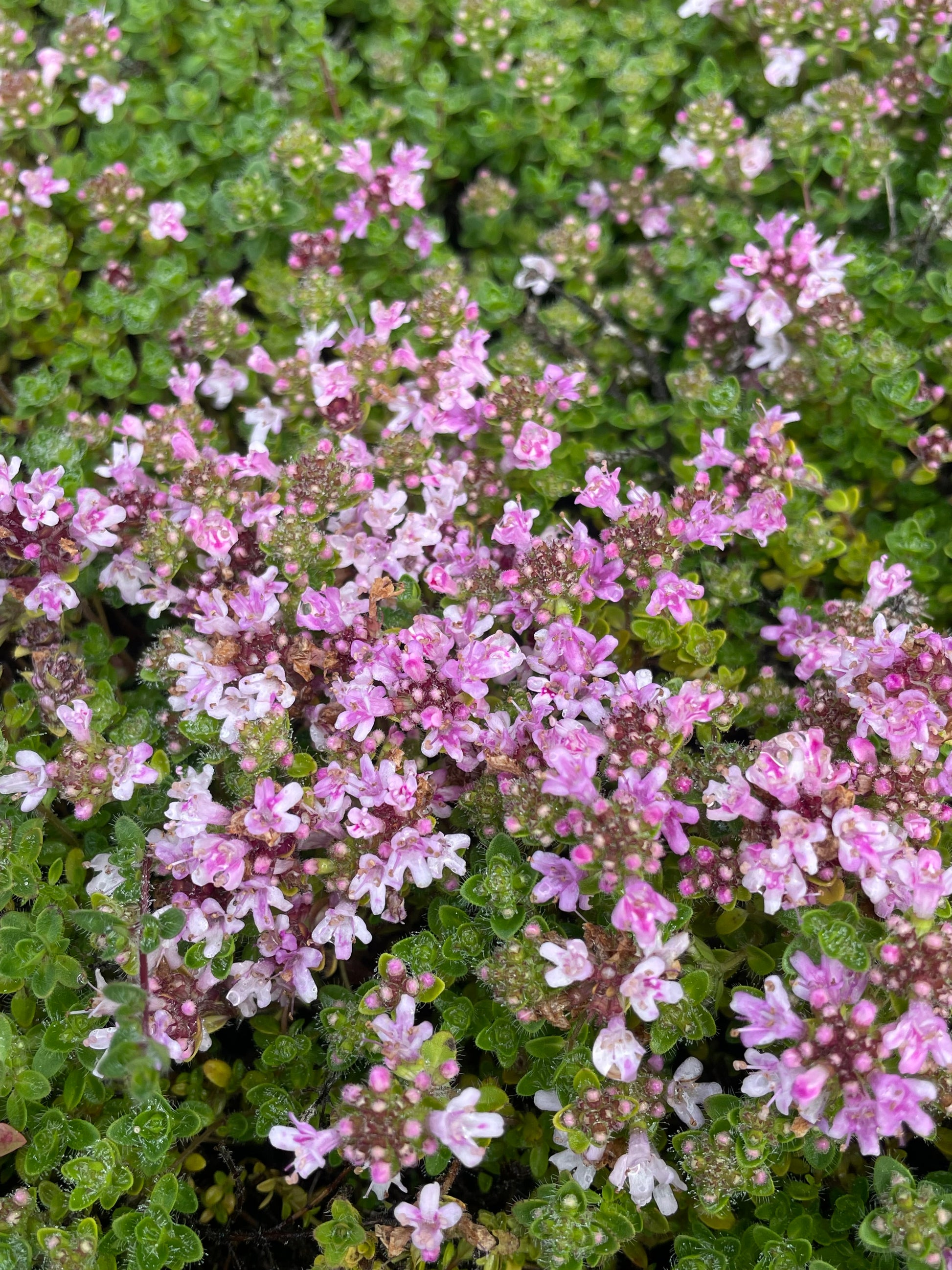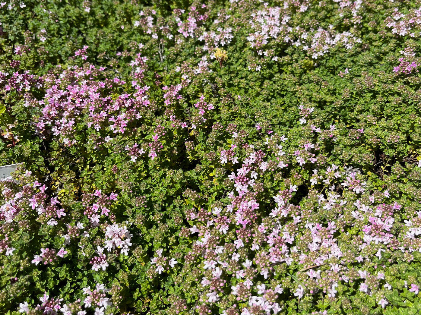 This very finely textured thyme will be the best choice for growing between pavers as it is a totally flat spreader that can be walked on. The flowers are a nice light pink to white color and cover the plant in mid summer attracting many bees. Our plants can be divided to make more plants, as it doesn't take much to get going. You will love this lovely little ground cover.