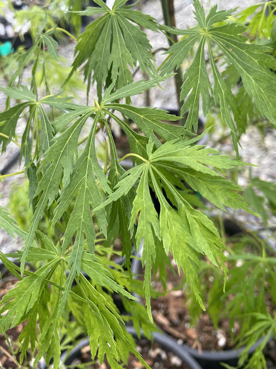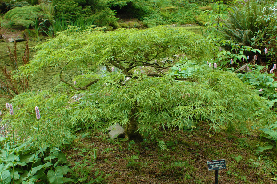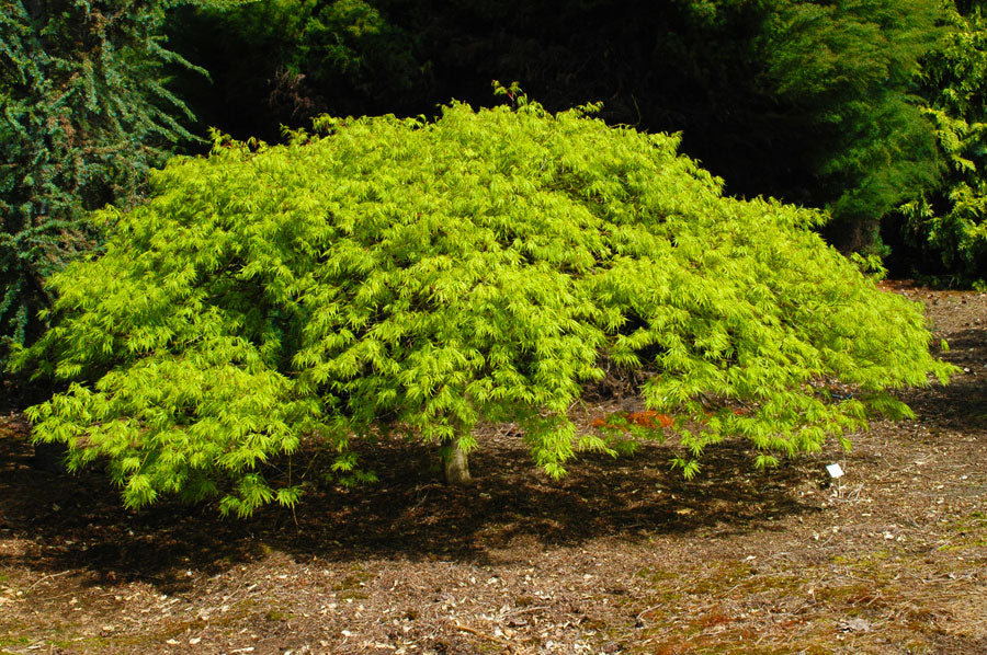 One of the few dissected leaf Japanese maples that mature into a tree form rather than a shrubby mound. The bright green are very lacy and the branches cascading to form a elegant dome-shaped specimen. The fall coloration is fabulous with orange, yellow, and crimson in the display. Of all the green laceleaf cultivars, this one is the most vigorous and adaptable.