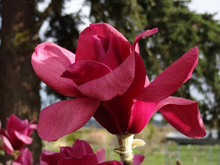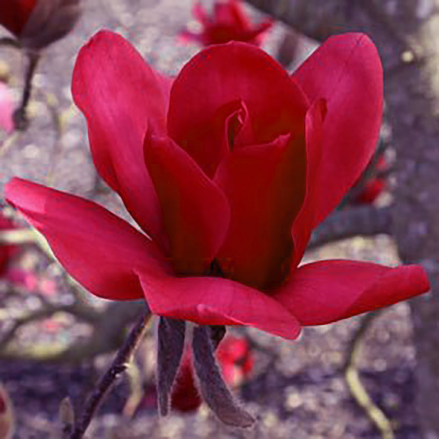 From the famous Jury Nursery in New Zealand, 'Vulcan' is among the darkest red of any Magnolia in the trade. The cup-and-saucer blossoms are quite large, 10-12 inches across, heavily textured, and will create one of the most beautiful sights when in bloom. The blooming period is from early to mid spring, and will bloom as a young tree. You can expect this tree to be 15 feet tall and 10 feet wide in 10 years. Excellent specimen tree, or in a mass planting. You will not be disappointment with Vulcan. Deciduous and hardy for zones 5-9.