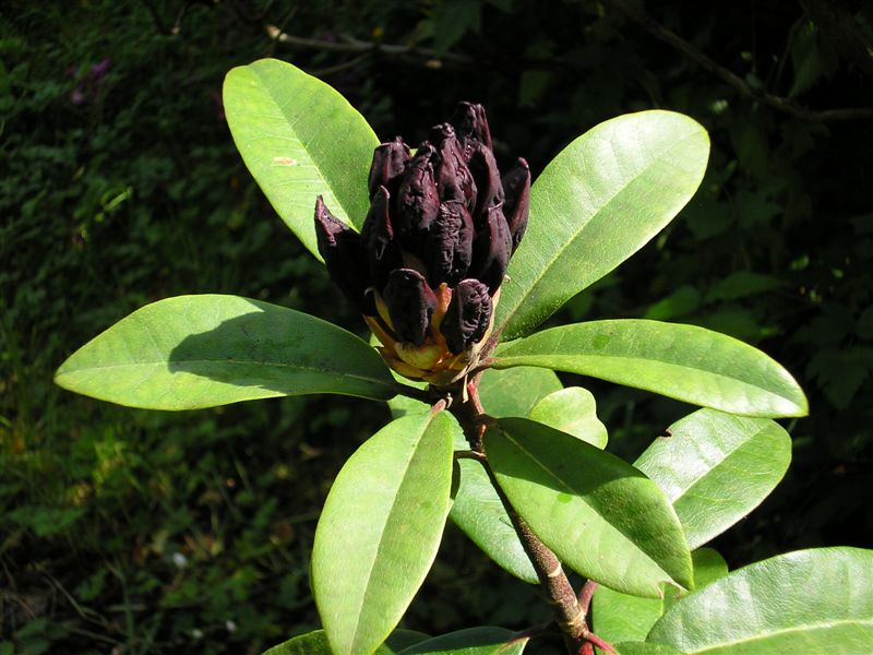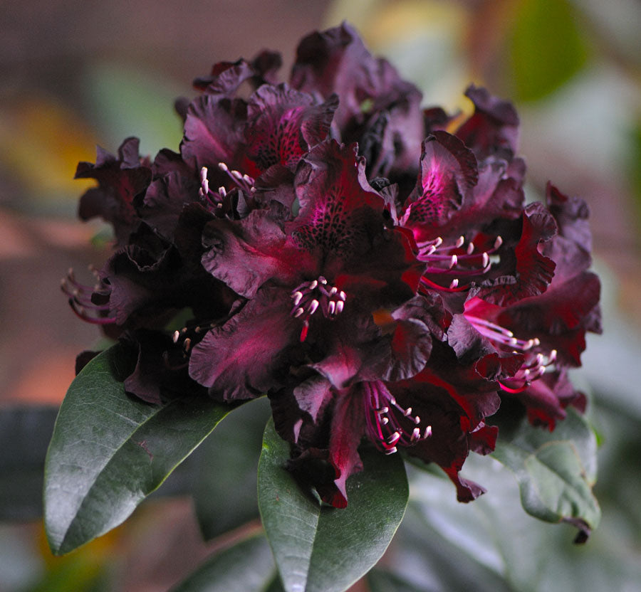 One of the parents of the famous 'Black Widow', this rhododendron is almost as dark. The buds open about as black as is possible, then open to the super dark burgundy color it is famous for. The plant is a bit open growing, so occasional pruning is recommended. The flowers open in mid to late April and will appear a very dark red, especially with the light coming from behind. This hybrid is the result of crossing a deep burgundy with a deep purple. The new growth after flowering is a maroon color. Warlock has been one of our top requested plants for many years now as that flower really is quite unique.