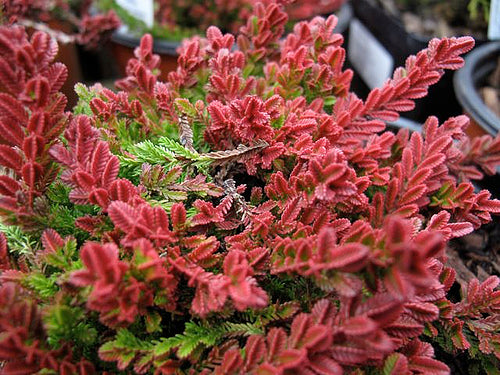 Lavender flowers begin the show on 'Winter Chocolate' when it blooms in August to October. Then in winter the foliage turns a rich red/bronze. In spring the new growth is a salmon color. Then, in summer the foliage is gold with pink tips. Extraordinary!