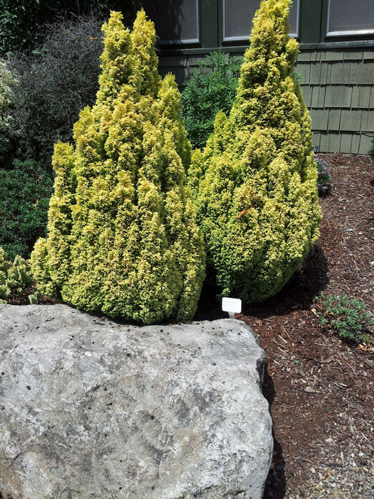 How unique...a blue green Saguaro Cactus! Not really, but it does have the look. Found as a sport of Chamaecyparis lawsoniana 'Wisselii', the leaves on this unusual conifer are a blue-green color and very congested. The plant will grow slowly, with the arms going out, then up. Noteworthy! We recommend planting in a raised bed for sharp drainage. This tree is sensitive to poor drainage. Be careful to give it the conditions it requires.