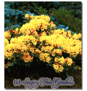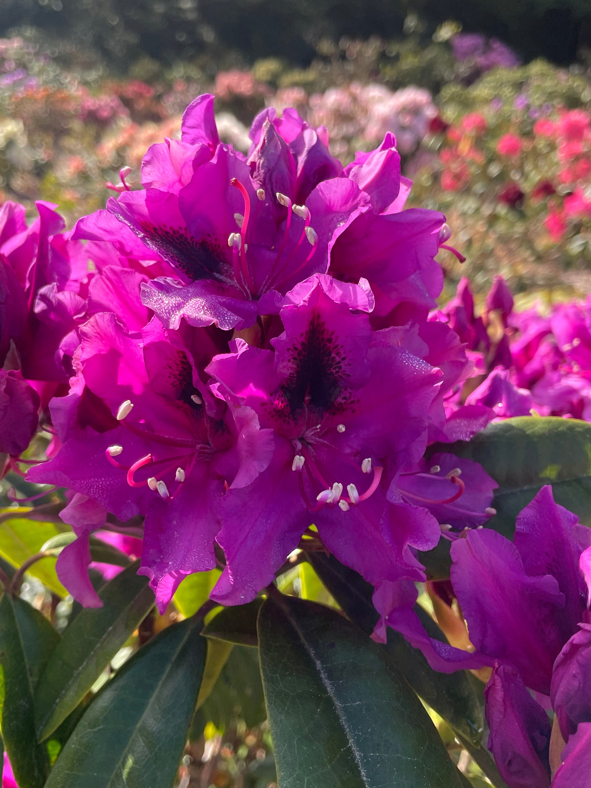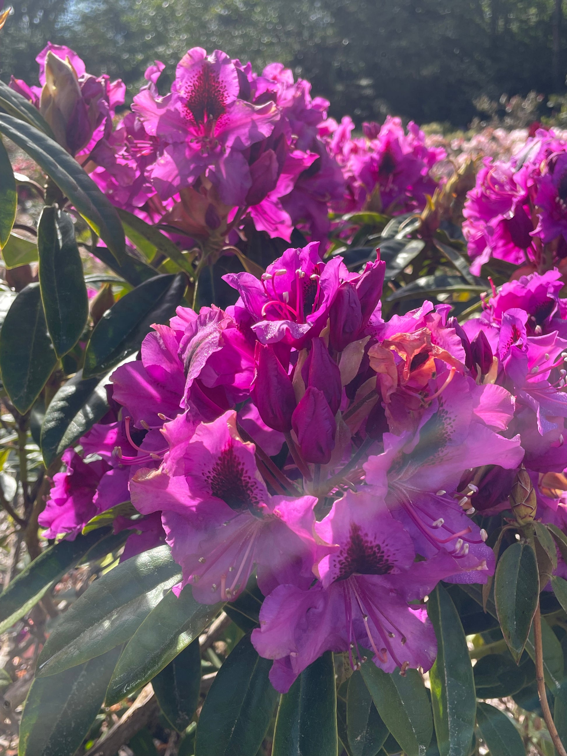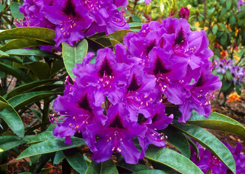 Lush, dark-green foliage on a full growing plant characterize this excellent rhododendron. The buds have a very unique look, with a light dusting of indumentum on them, then in early May they open to full trusses of rich purple with a black eye. A purple lover's favorite!